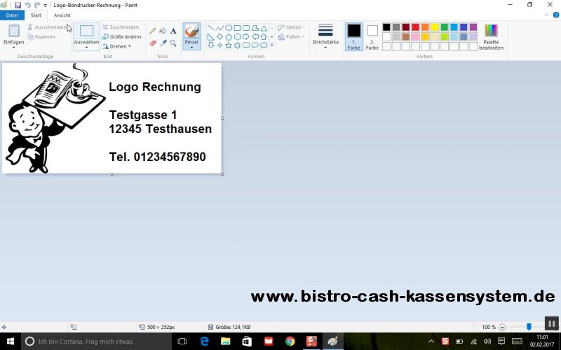 Wenn man Paint oder ein anderes Grafikprogramm gestartet hat, muss man als Erstes die Größe des Logos einstellen. Die Breite des Logos sollte 500 Pixel sein. Mit dieser Breite nutzt man die vorhandene Fläche eines 80er Bons maximal aus. In der Höhe hat man mehr oder weniger freie Hand. Man sollte es mit der Höhe des Logos aber auch nicht übertreiben, denn zum einen kostet ein sehr großes Logo etwas Druckzeit und zum zweiten verbraucht jedes Logo auch Papier. Mal abgesehen davon, besitzt jeder Bondrucker auch nur einen begrenzten Speicherplatz für Logos.