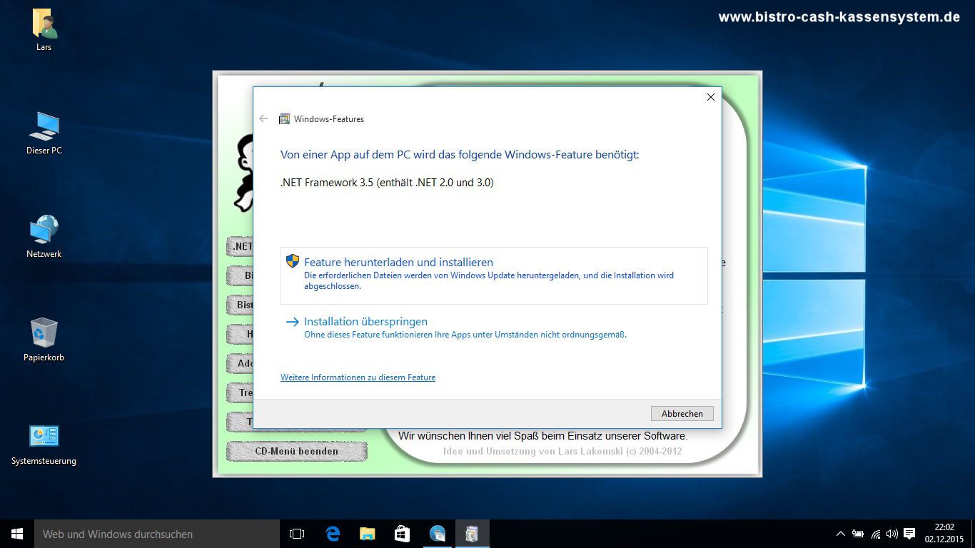 Wenn Bistro-Cash auf einem neuen Windows 8 oder Windows 10 Kassensystem installiert wird, dann kann es nach der Auswahl „Bistro-Cash installieren“ aus dem CD-Menü zu der folgenden Meldung kommen. Ob die Meldung auch bei Ihnen kommt ist abhängig vom Hersteller des Systems, manche vorinstallierten Windows Versionen haben das benötigte Framework schon ab Werk mit dabei. Also wenn die Softwarekomponente Framework 3.5 bei Ihnen nicht vorinstalliert ist, dann erscheint die folgende Meldung bei Ihnen.